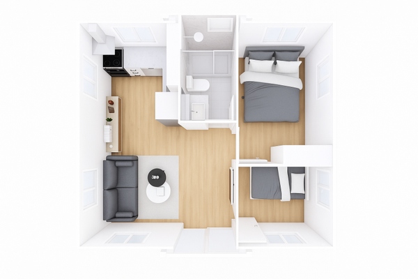 A two bedroom  home that unfolds to an expansive 36m². It consists 2 beedroom, 1 living room, 1 Dry and wet toilet & 1 Kitchen. The wall ,floor colour can be customised according to the customer needs.